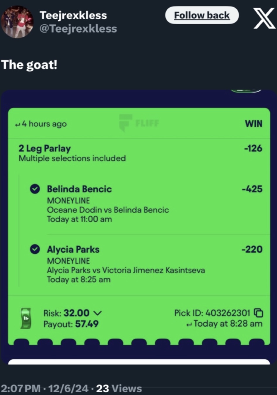 I'm on Machac over Tsitsipas for a few reasons. Tsitsipas has not been locked in for awhile. Half of last year he was playing his worst tennis and recently losing in straights to Vukic at (-435) favorite. Machac has finally found his form and is 4-0 in his L4 against top 50 opponents. Decided to pair with Sinner 3-0 simply because I cannot picture him dropping a set this early in the tournament. Hopefully I don't eat those words. He's in solid form and hasn't dropped a set to anyone besides Alcaraz in his L11 straight matches. Let's Cash this Shit.